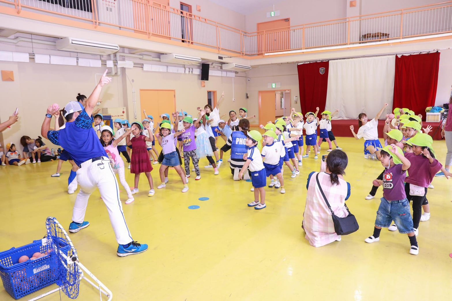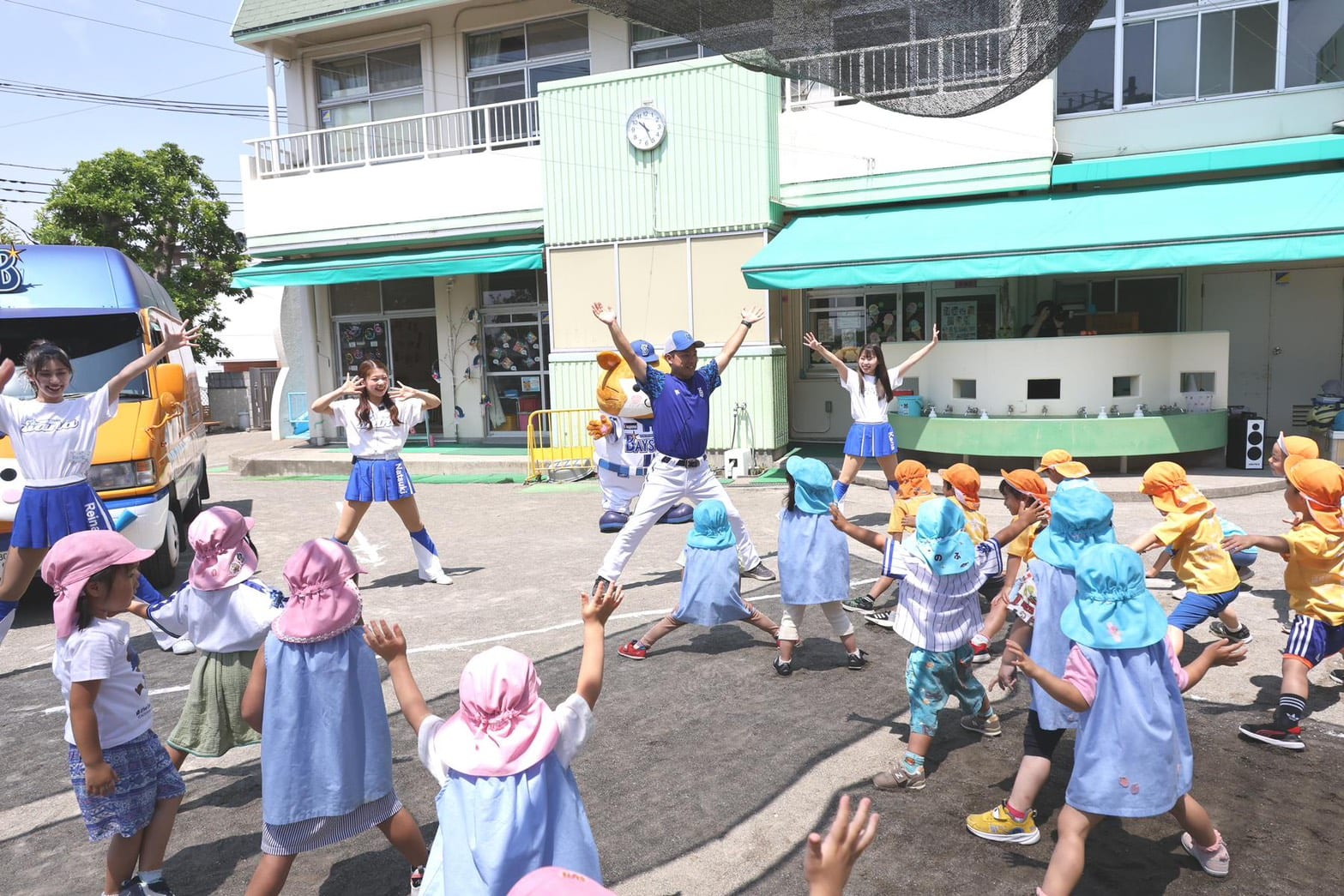 ベイスターズが掲げるBみらいアクションにおける野球ふれあい訪問は、横浜市および横須賀市の幼稚園や保育園へ、球団マスコットのDB.スターマンと公式パフォーマンスチームdianaと共に訪問し、小さな子どもたちに野球の楽しさを知り、興味をもってもらうための活動です。